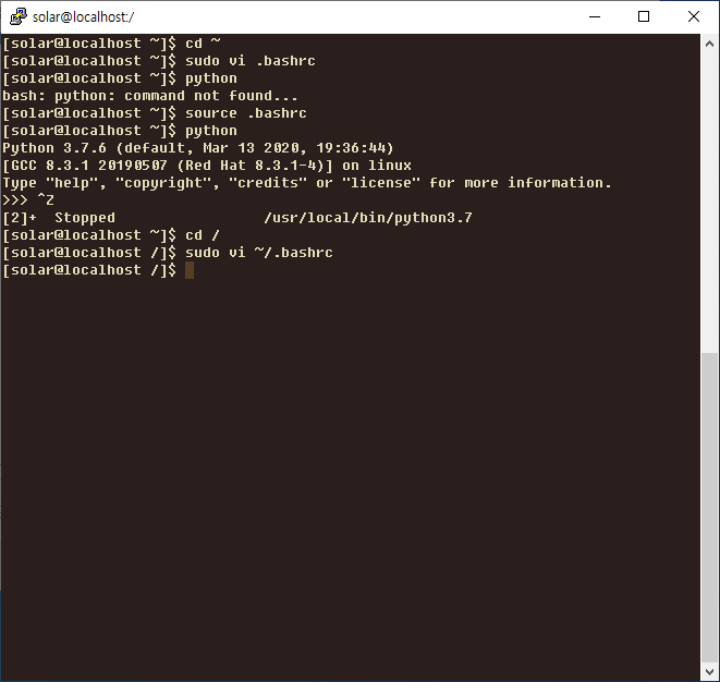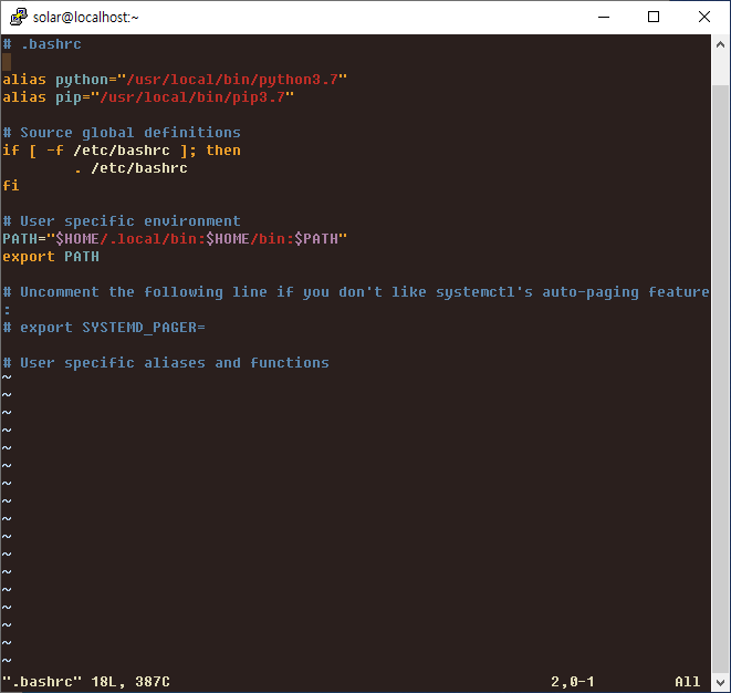 .bashrc 파일에 alias python="/usr/local/bin/python3.7" 추가