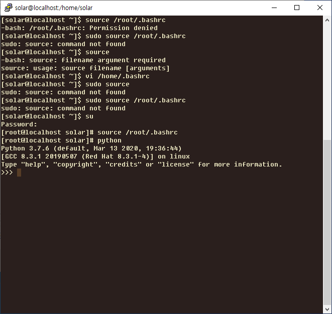 위 내용대로하면 root 계정에서만 python 명령어로 python 3.7.6 이 실행되는 것을 확인했다.
