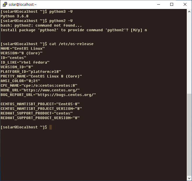 python2를 해보니 Install할지 물어보는 걸 보면 CentOS 8버전에는 python2가 없는 듯 합니다.