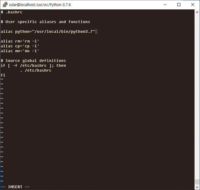 .bashrc 파일에 alias python="/usr/local/bin/python3.7" 추가