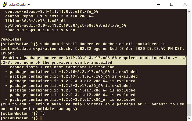 package docker-ce-3:19.03.8-3.el7.x86_64 requires containerd.io >= 1.2.2-3, but none of the providers can be installed