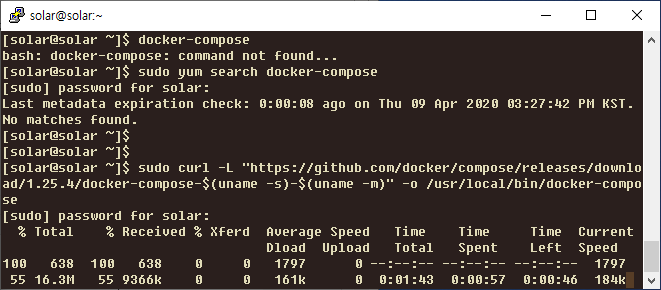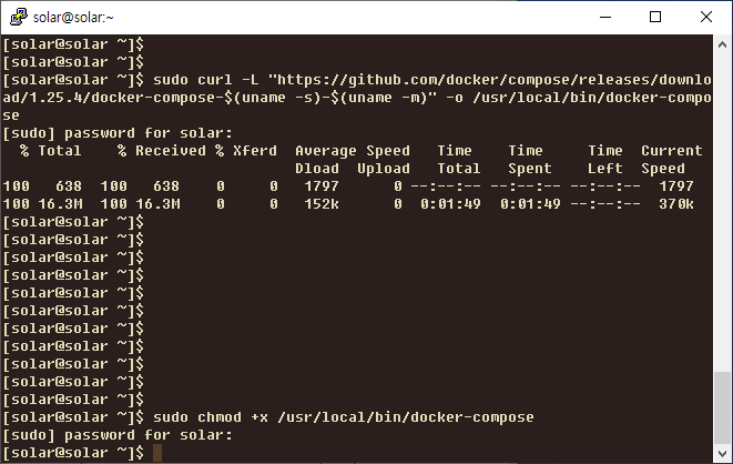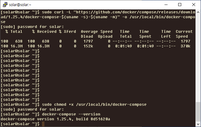 $ sudo curl -L "https://github.com/docker/compose/releases/download/1.25.4/docker-compose-$(uname -s)-$(uname -m)" -o /usr/local/bin/docker-compose