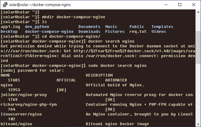 docker-compose 가 sudo 권한을 요청할 때가 많습니다.