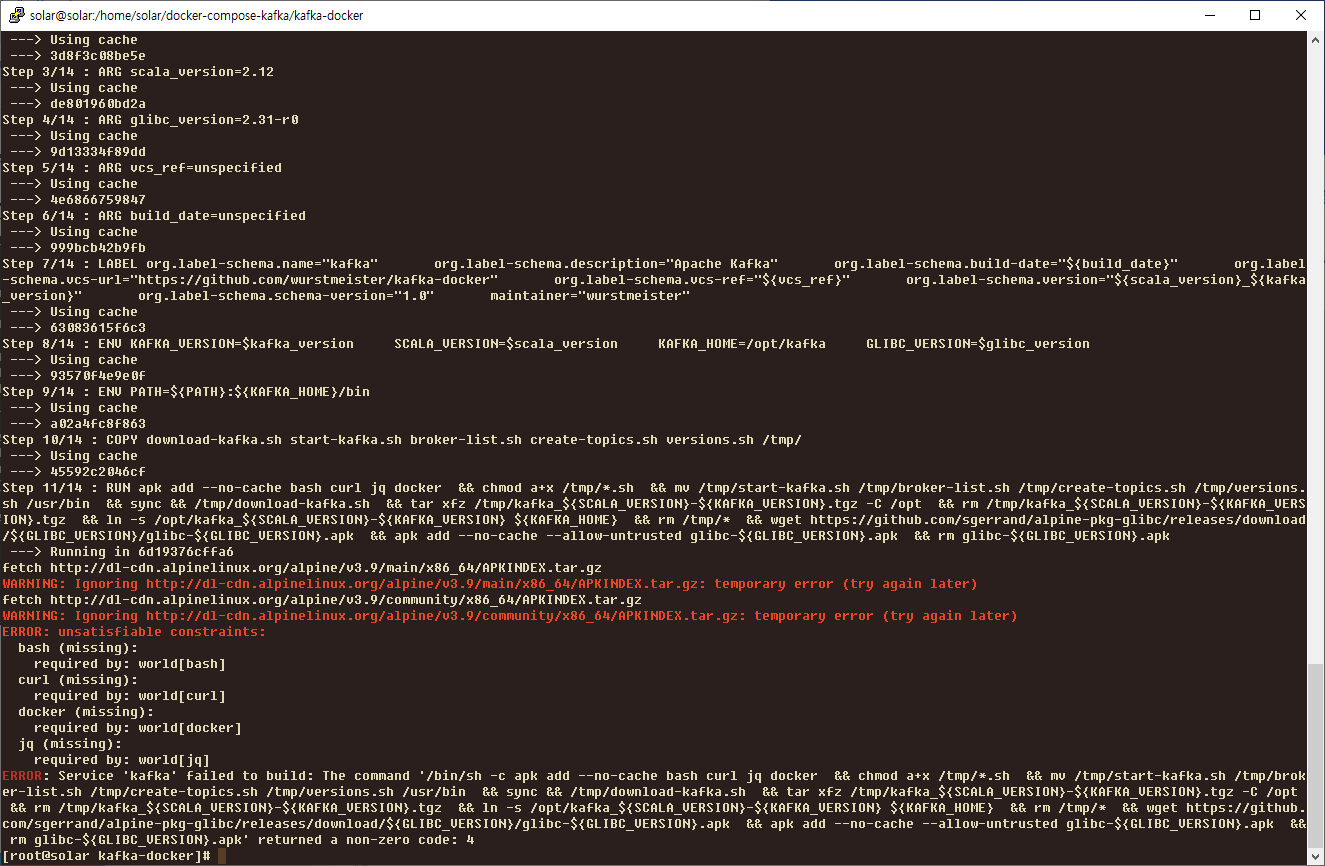 ERROR: Service 'kafka' failed to build: The command '/bin/sh -c apk add --no-cache bash curl jq docker && chmod a+x /tmp/*.sh && mv /tmp/start-kafka.sh /tmp/broker-list.sh /tmp/create-topics.sh /tmp/versions.sh /usr/bin && sync && /tmp/download-kafka.sh && tar xfz /tmp/kafka_${SCALA_VERSION}-${KAFKA_VERSION}.tgz -C /opt && rm /tmp/kafka_${SCALA_VERSION}-${KAFKA_VERSION}.tgz && ln -s /opt/kafka_${SCALA_VERSION}-${KAFKA_VERSION} ${KAFKA_HOME} && rm /tmp/* && wget https://github.com/sgerrand/alpine-pkg-glibc/releases/download/${GLIBC_VERSION}/glibc-${GLIBC_VERSION}.apk && apk add --no-cache --allow-untrusted glibc-${GLIBC_VERSION}.apk && rm glibc-${GLIBC_VERSION}.apk' returned a non-zero co