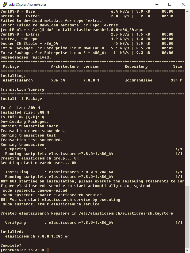 $ sudo dnf install elasticsearch-7.8.0-x86_64.rpm