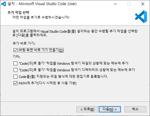 기본설정에 PATH 추가가 있고 저는 바탕화면 바로가기까지 체크해줬습니다.