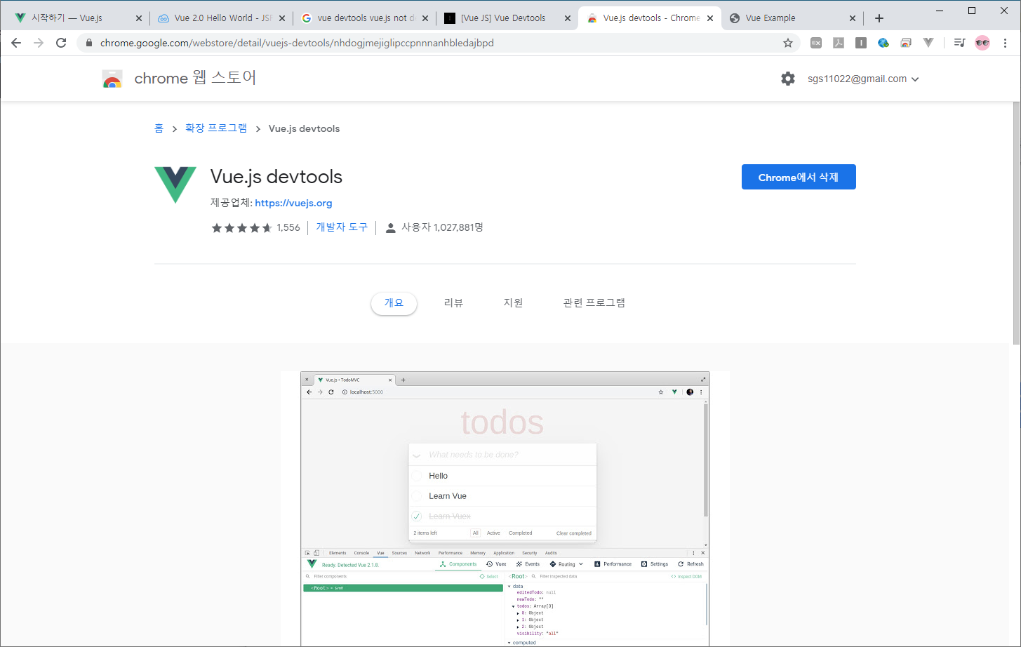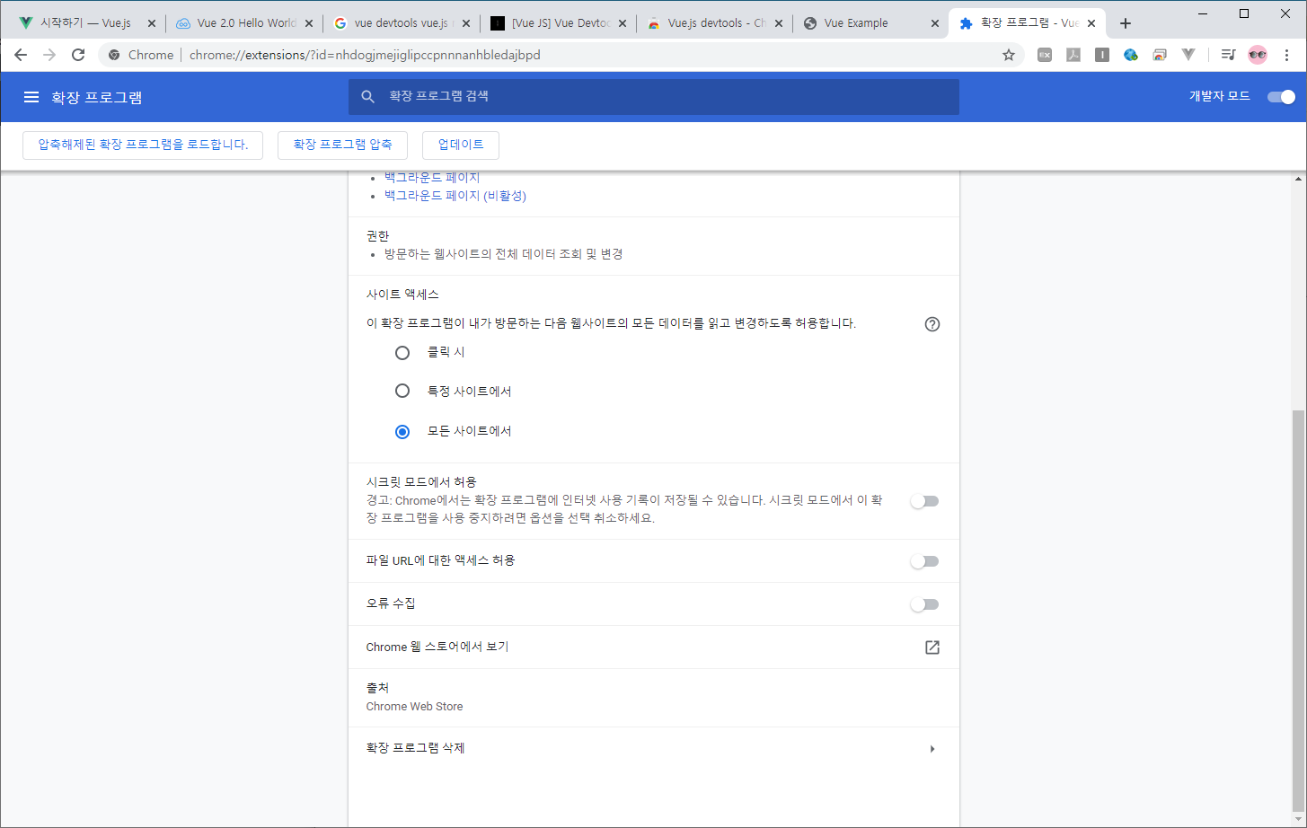 확장페이지 관리 페이지에서 vue.js devtools 를 들어가보자.