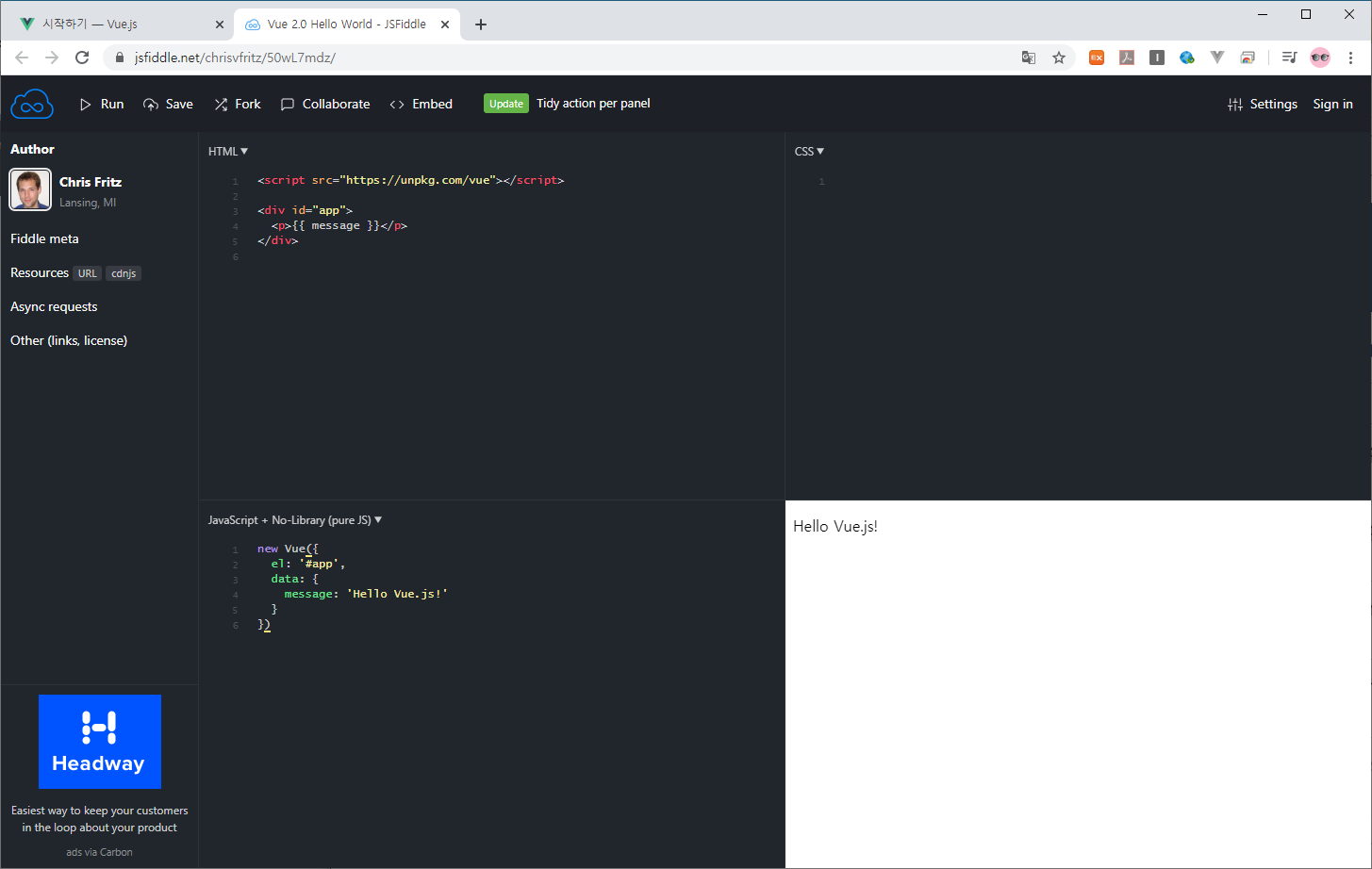 시작하기를 보면 JS Fiddle 예제를 보는게 가장 쉬운샘플이라고 나와있다.
