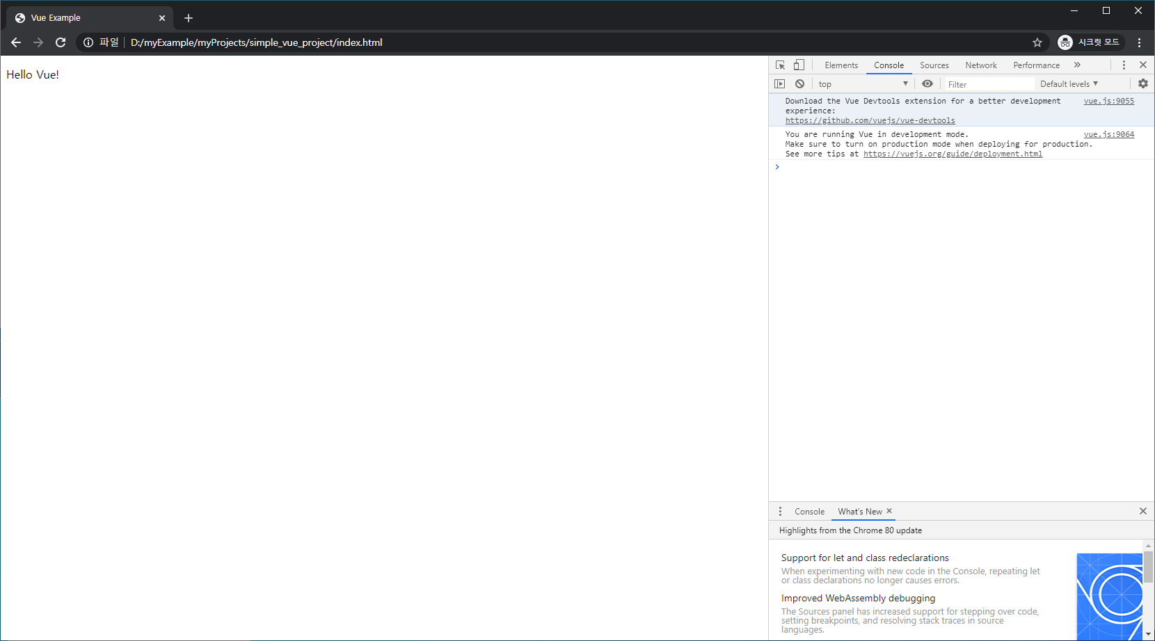 이제 index.html 을 열어보면 vue.js 기본 예제는 완성이다.