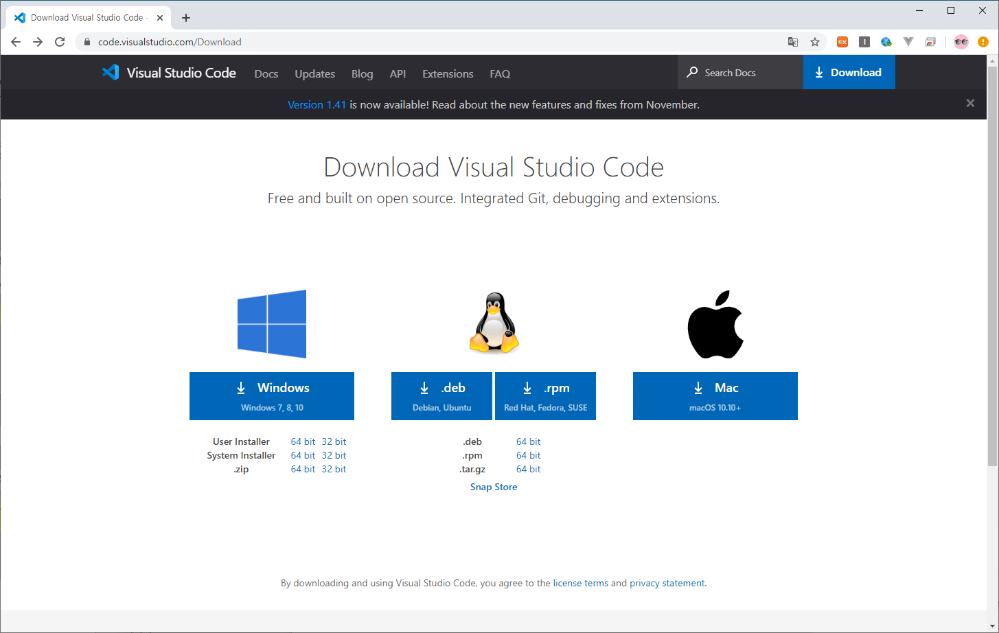 먼저 Visual Studio Code 홈페이지에서 IDE를 다운로드한다