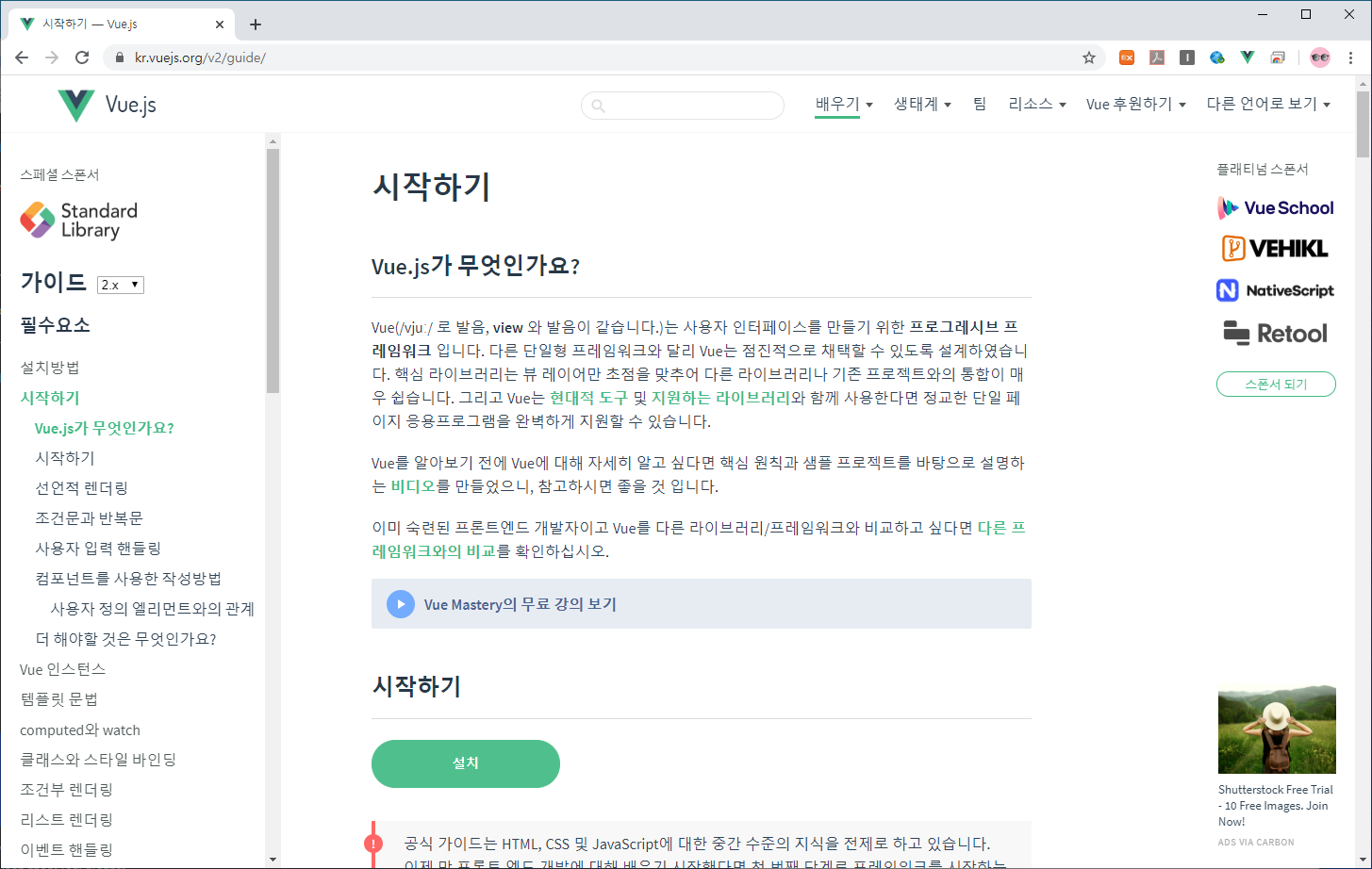 Vue.js 를 검색하면 가장 위에 나오는 페이지이다.