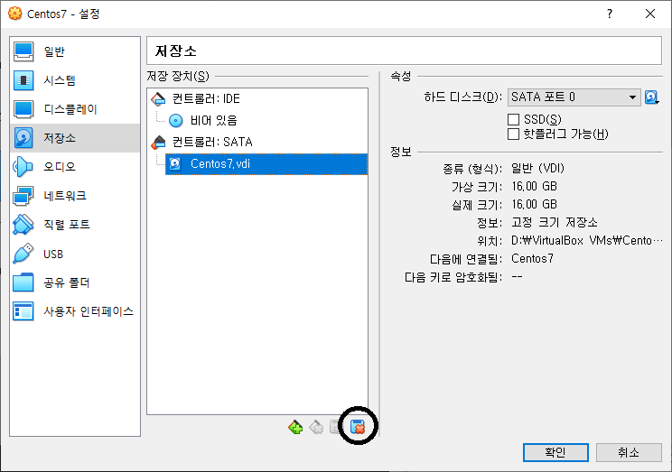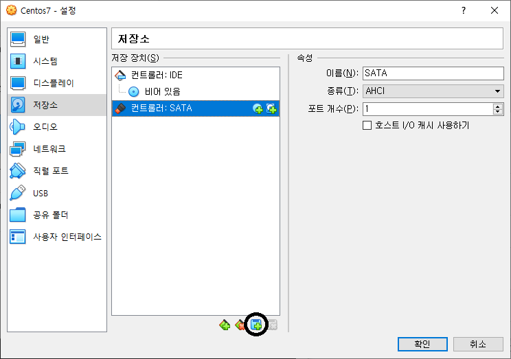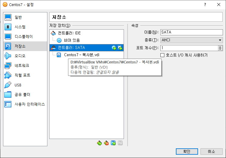 활성화된 디스크 + 아이콘을 클릭해 다른 드라이브로 복사한 vdi 파일을 다시 등록해주자.