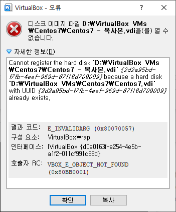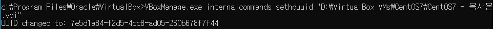 VBoxManage.exe internalcommands sethduuid "D:\VirtualBox VMs\CentOS7\CentOS7 - 복사본.vdi"