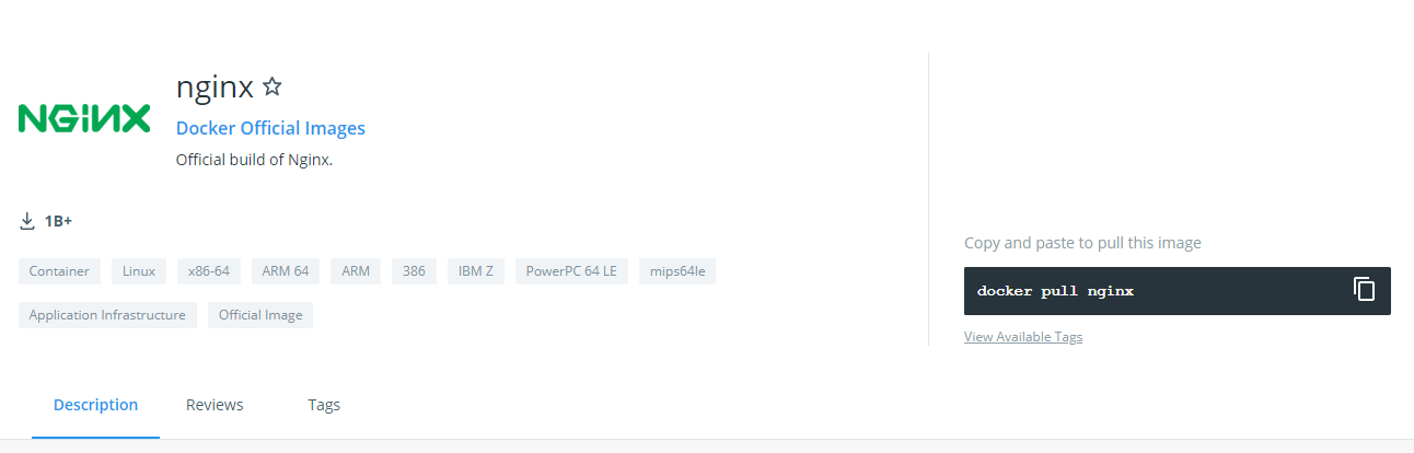 오른쪽에 보이는 명령어로 nginx 이미지를 다운로드할 수 있습니다.