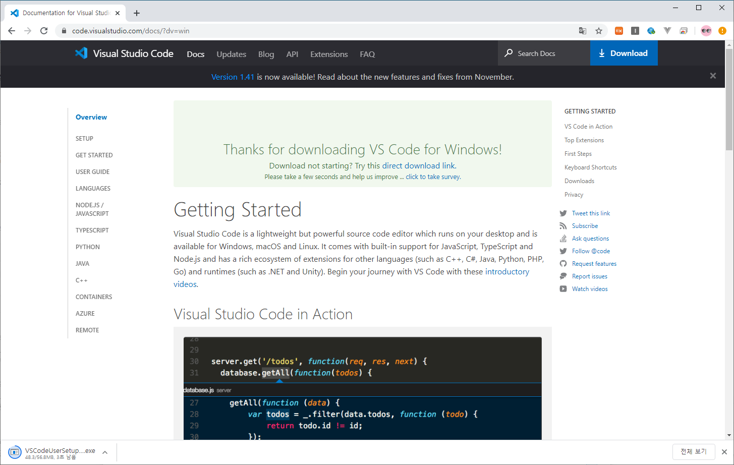 먼저 Visual Studio Code 홈페이지에서 IDE를 다운로드한다