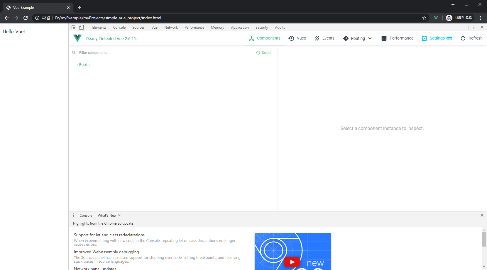 F12를 눌러 개발도구를 켜보니 크롬이 vue-devtools 을 추천해주고 있다.