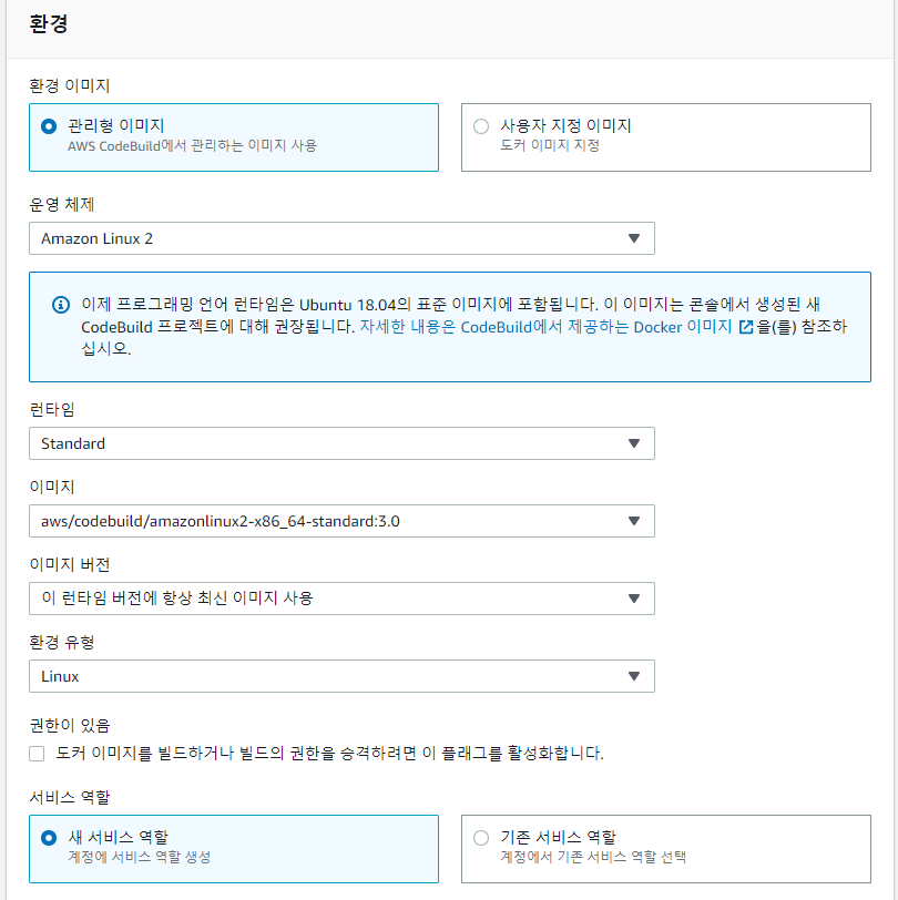 빌드환경은 aws linux 를 써도 무관하며 서비스 역할이 있을 시 등록해주면 됩니다.