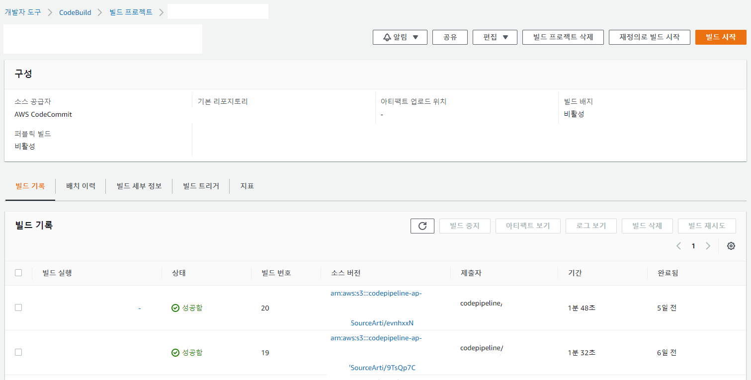 해당 페이지에서는 빌드, 빌드 기록 확인, 세부정보 등을 확인할 수 있습니다.