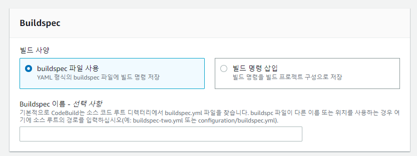 기본적으로 buildspec 파일을 사용하도록 설정되어 있습니다.