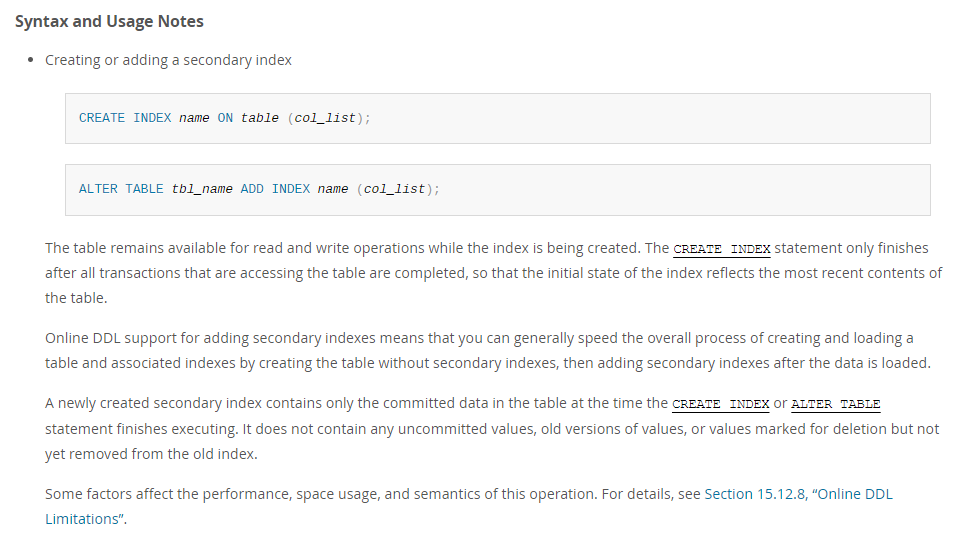 Online DDL 이라는 기술로 인덱스 생성 작업중에도 읽기 및 쓰기에 영향이 없다는 내용이였다.